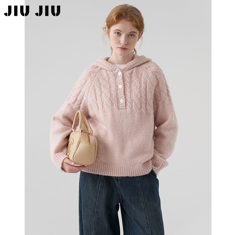 JIUJIU北欧风复古连帽麻花毛衣女秋冬2025新款设计感休闲针织衫