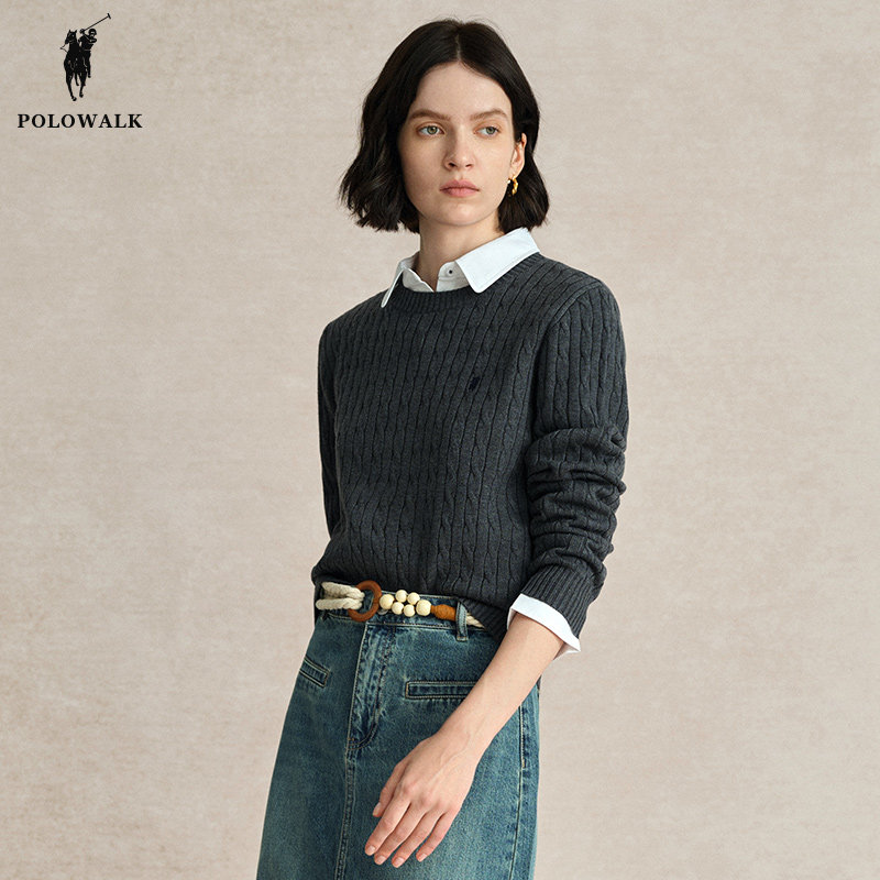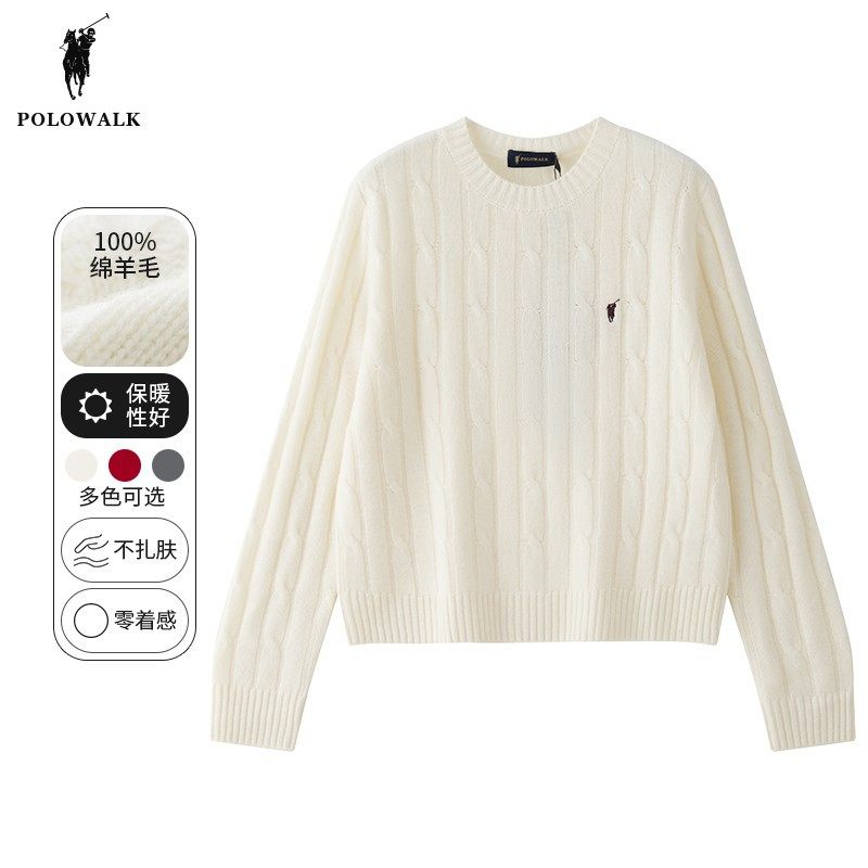 POLOWALK麻花毛衣女2025冬季新款保罗女装圆领羊毛衫保暖内搭上衣
