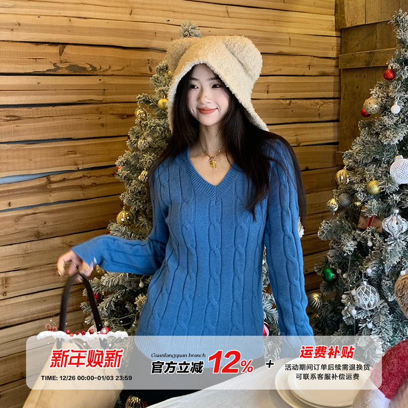 橘子树在哪儿韩系蓝色V领麻花毛衣女秋冬设计感显瘦套头针织上衣