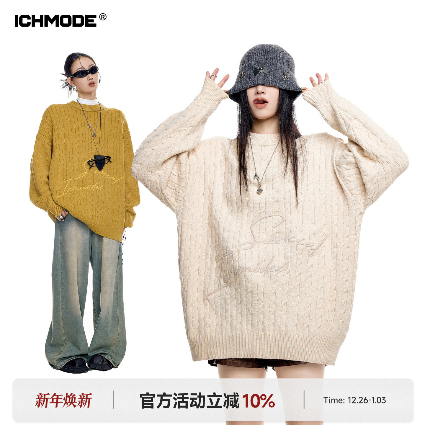 ICH MODE 美式复古慵懒刺绣麻花毛衣女春季休闲圆领毛针织衫上衣