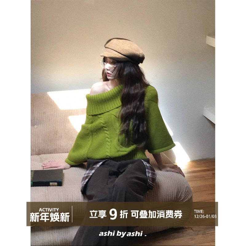 花纱一字领镂空麻花毛衣女套头2025初秋新款宽松慵懒风上衣针织衫