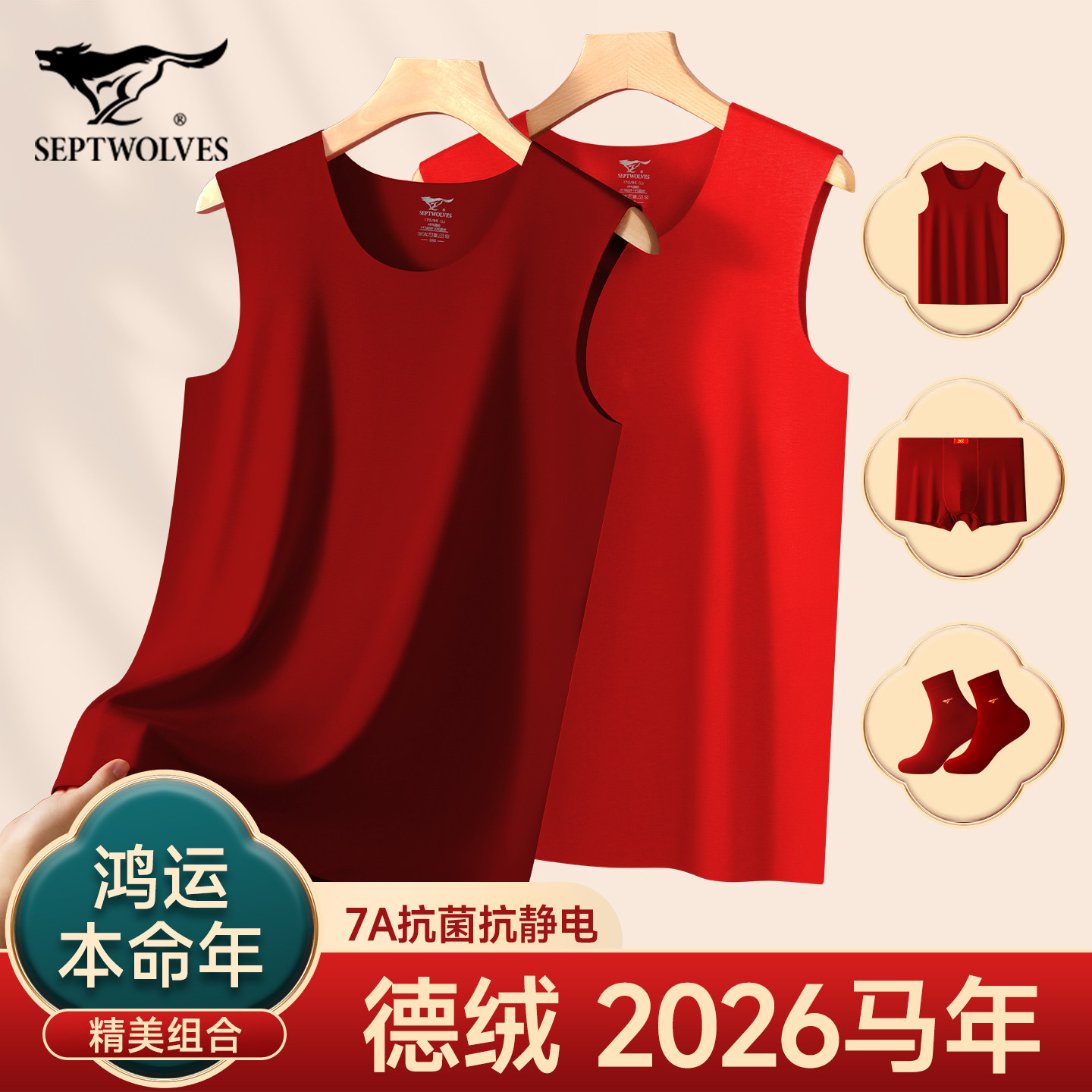七匹狼男士纯棉本命年大红色背心2026马年袜子内裤头套装暗红酒红