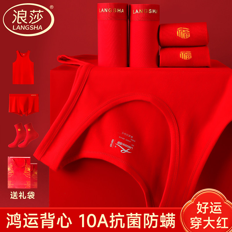 浪莎男士大红色纯棉背心本命年结婚衣服男款内衣内裤套装2026马年