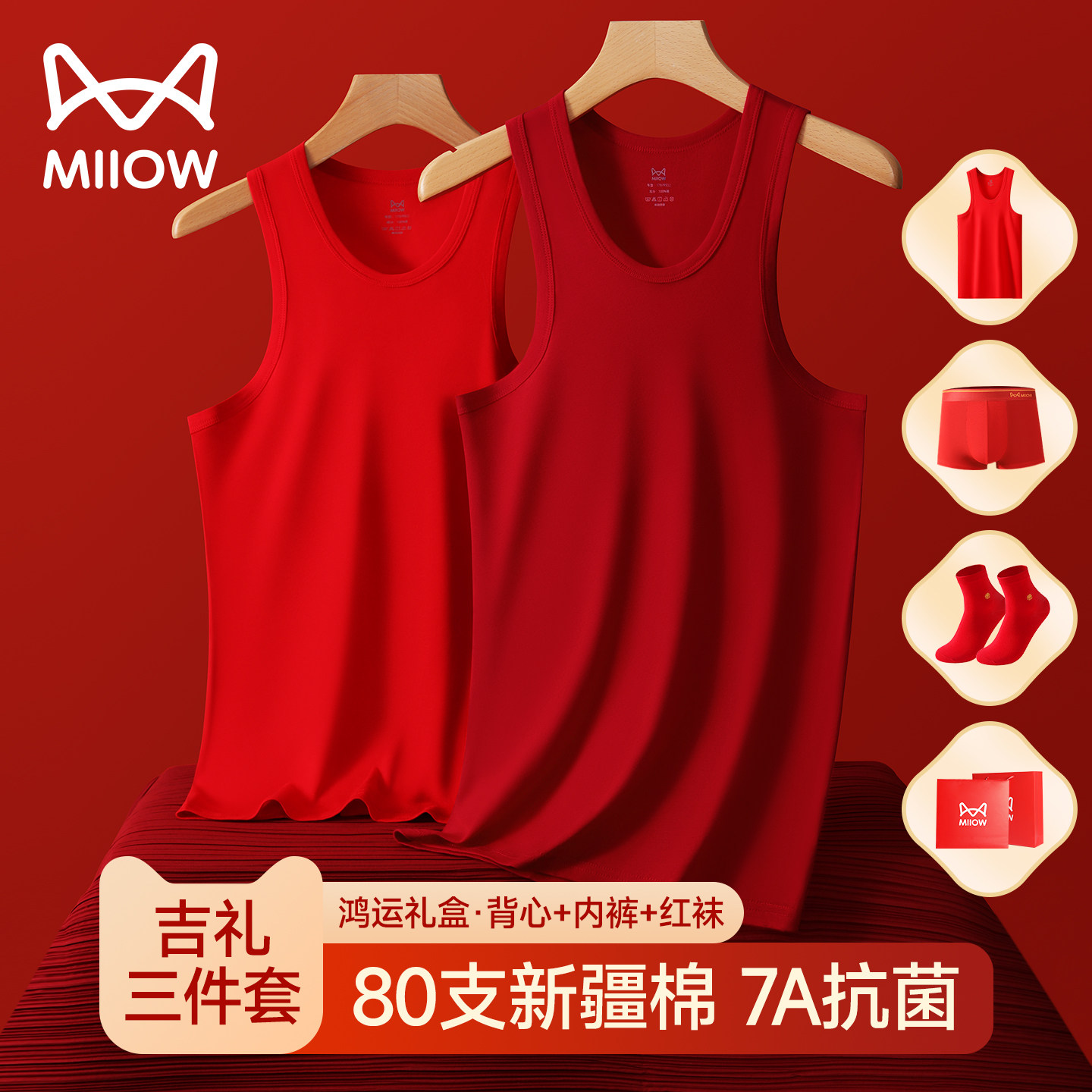 猫人大红色背心男士款纯棉2026年属马本命年结婚礼物内裤袜子套装