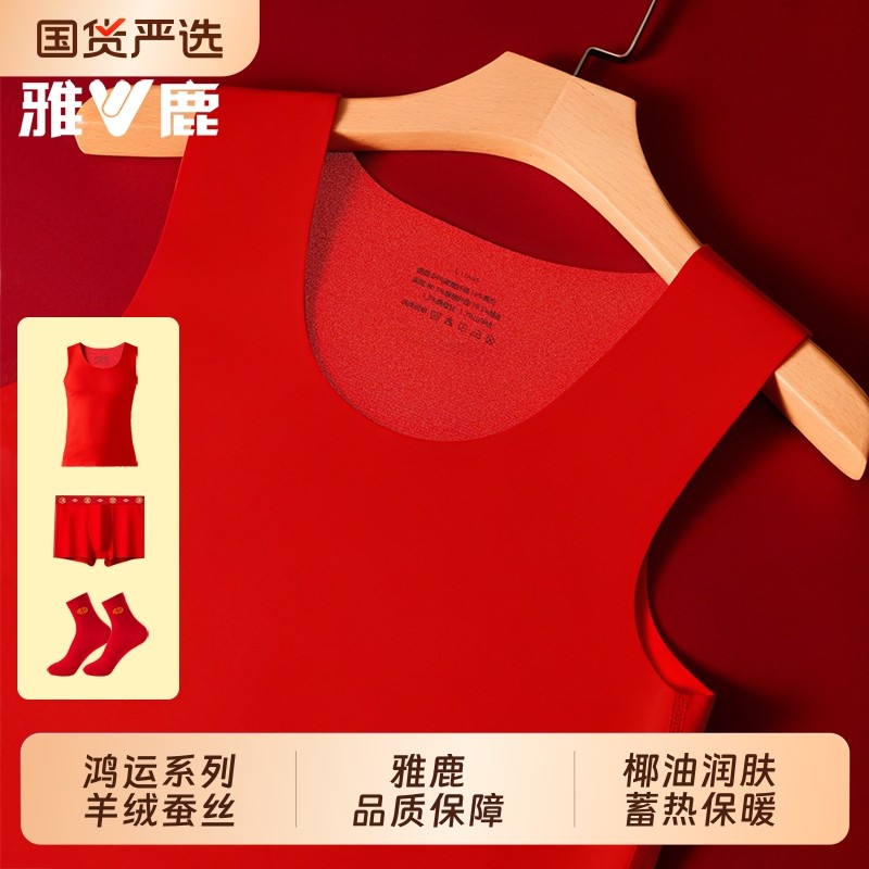 雅鹿保暖背心男士德绒发热无痕本命年大红色马年结婚内裤袜子套装
