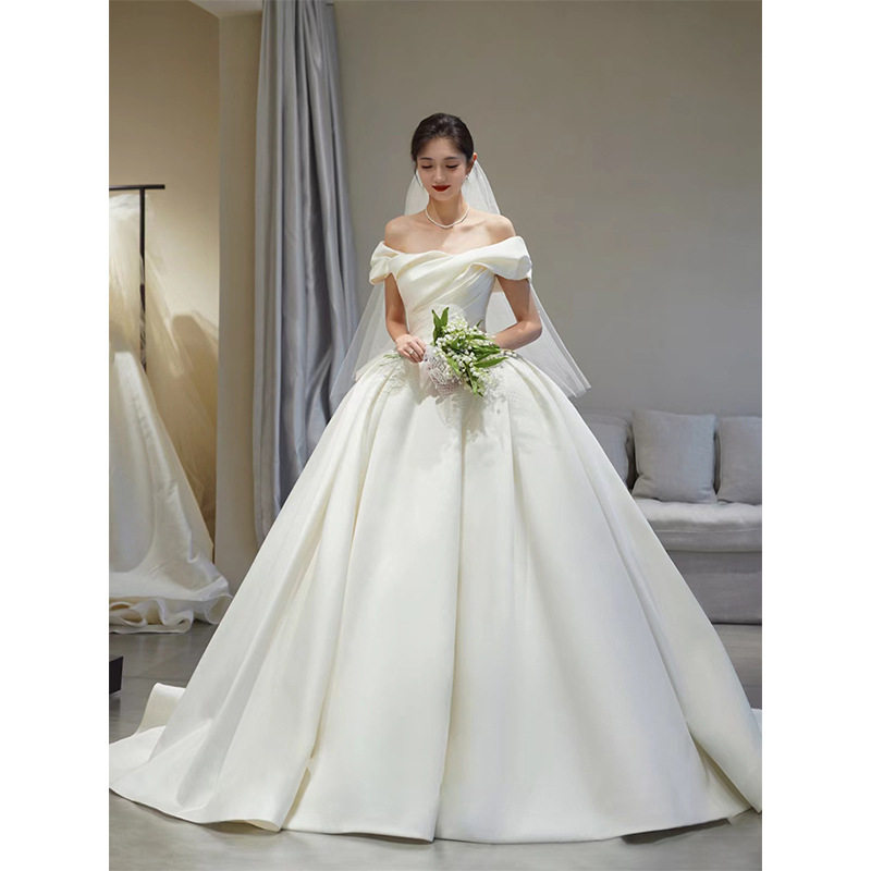 主婚纱礼服新娘2025新款高级质感一字肩缎面大拖尾显瘦齐地夏季款