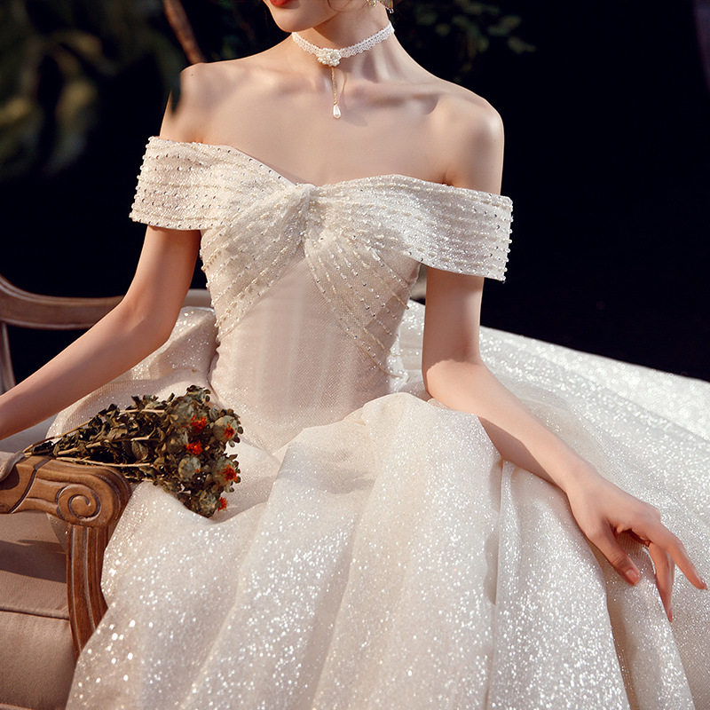 星空主婚纱礼服新娘2024新款大拖尾小个子法式轻一字肩齐地109