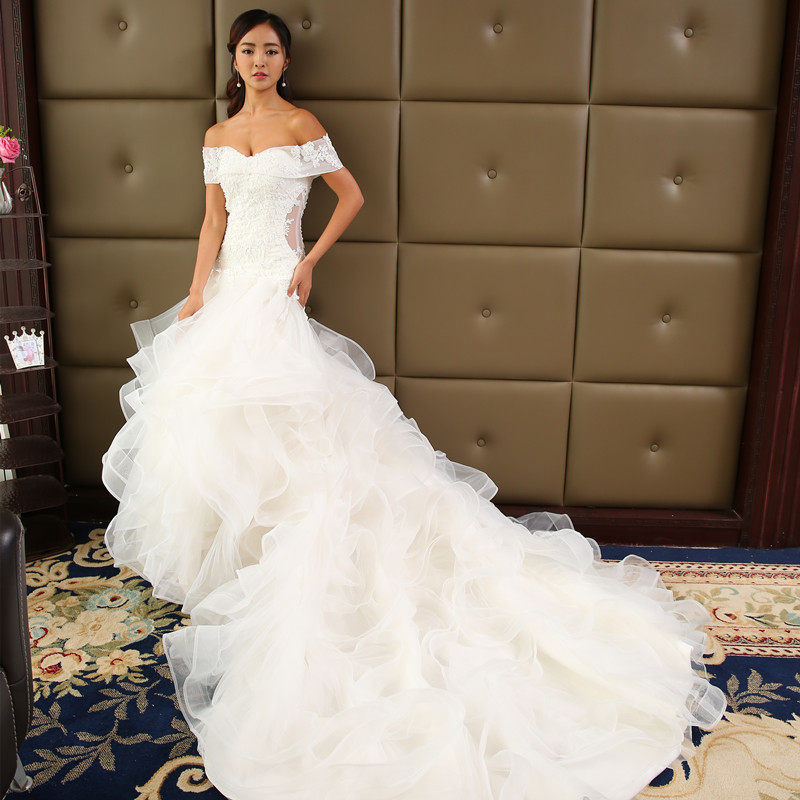 - 一字肩婚纱礼服拖尾 新娘