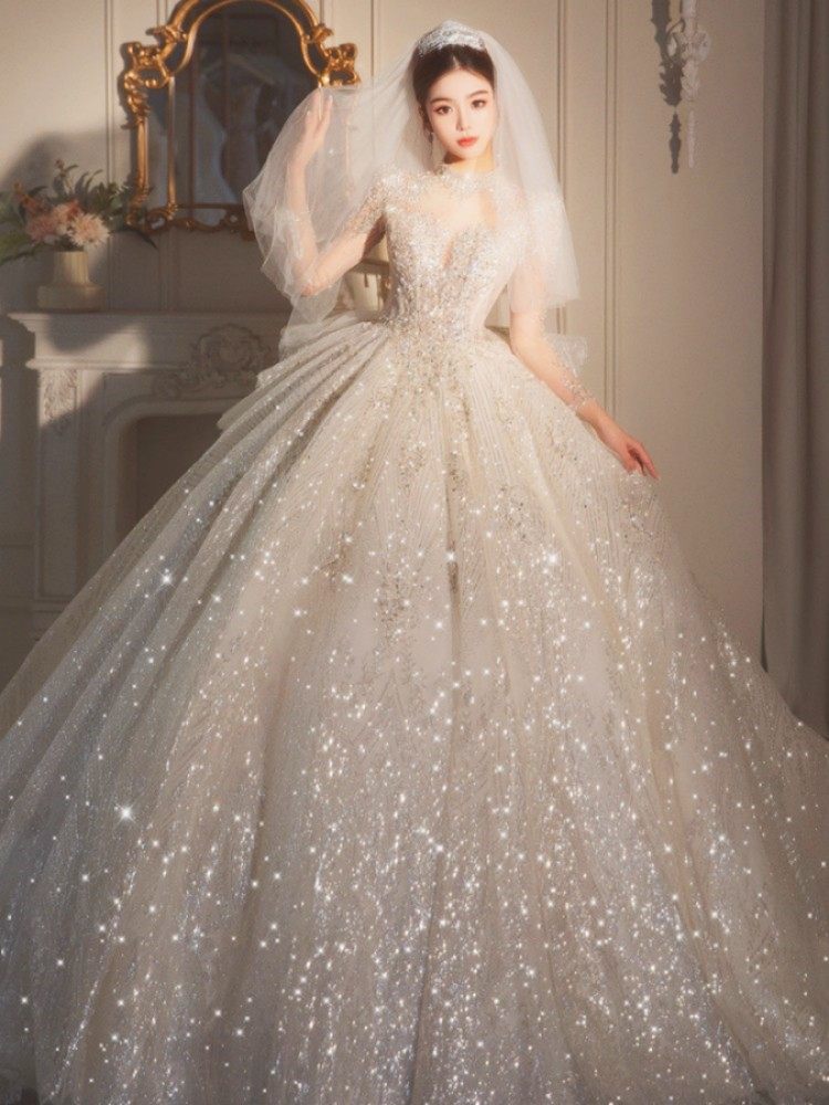 长拖尾婚纱新娘结婚礼服长袖立领显瘦公主齐地大码Wedding Gown