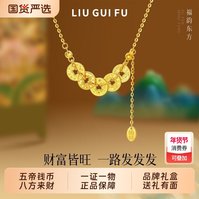 六桂福珠宝五帝钱S925纯银项链女锁骨链送妈妈铜钱情人节新年礼物