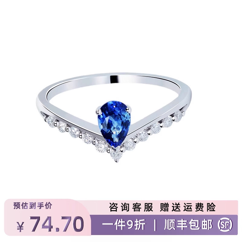 戒指S925银群镶嵌水滴形蓝钻石排镶钻石时尚V字华丽戒指气质百搭a