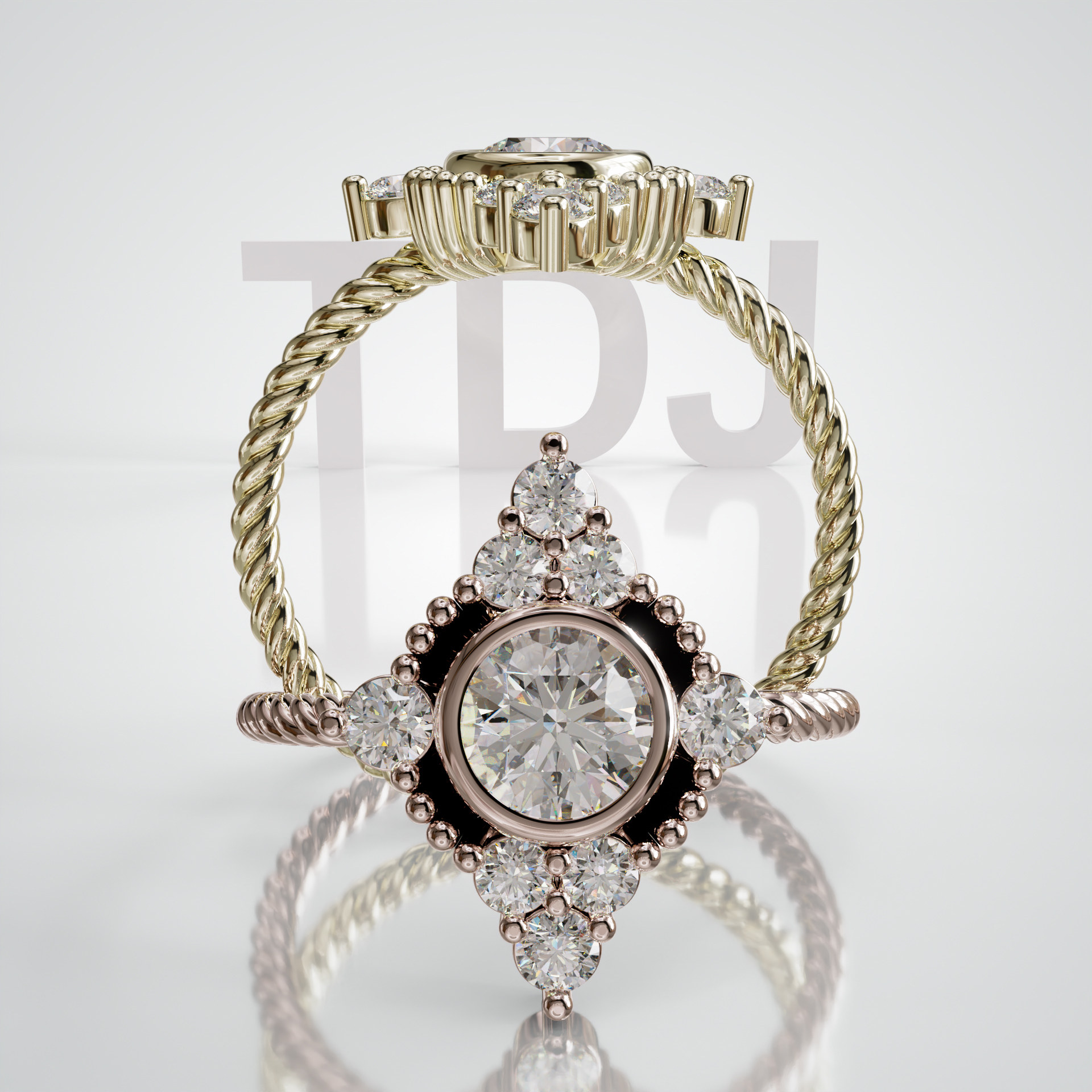 18K金圆主石麻花戒臂复古群镶戒指可定制轻奢复古订婚戒女款婚戒