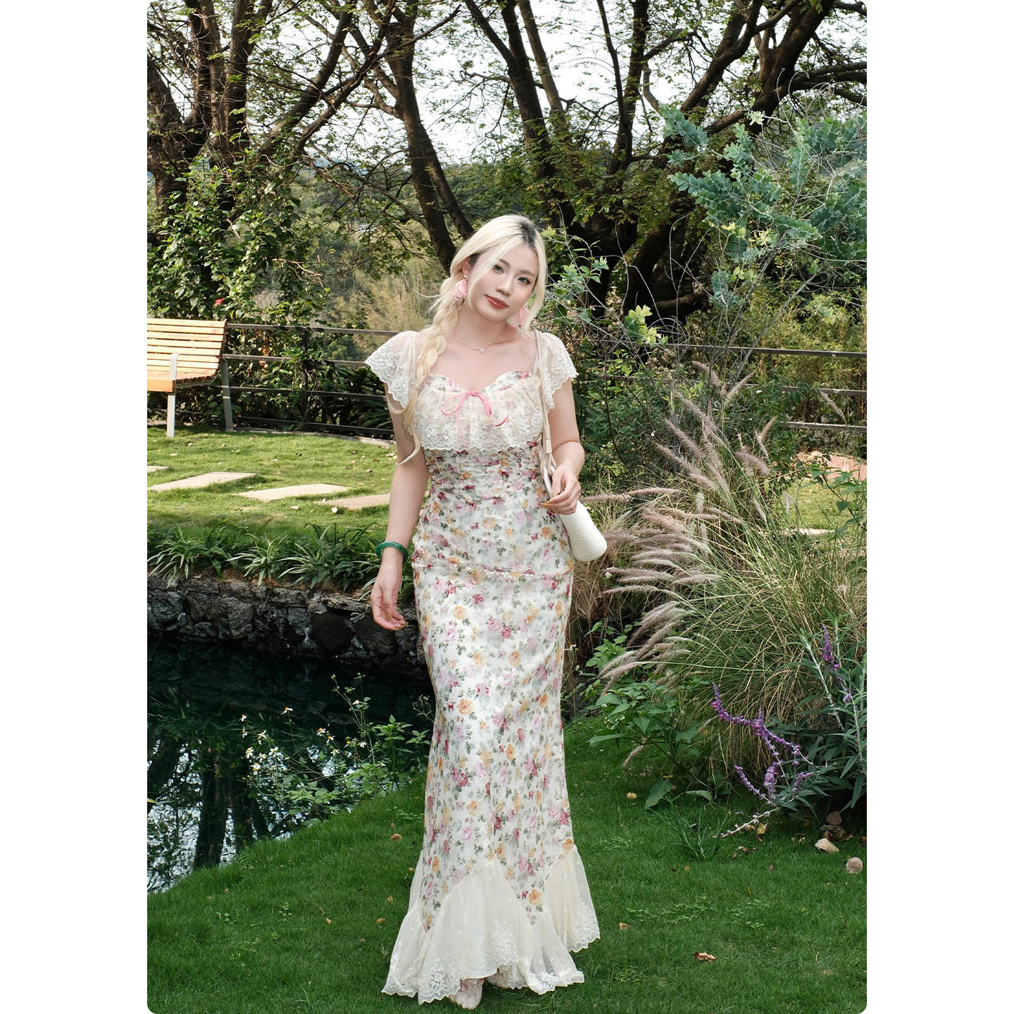 糯米子[南法假日]法式碎花连衣裙女夏微胖大码显瘦蕾丝鱼尾长裙子