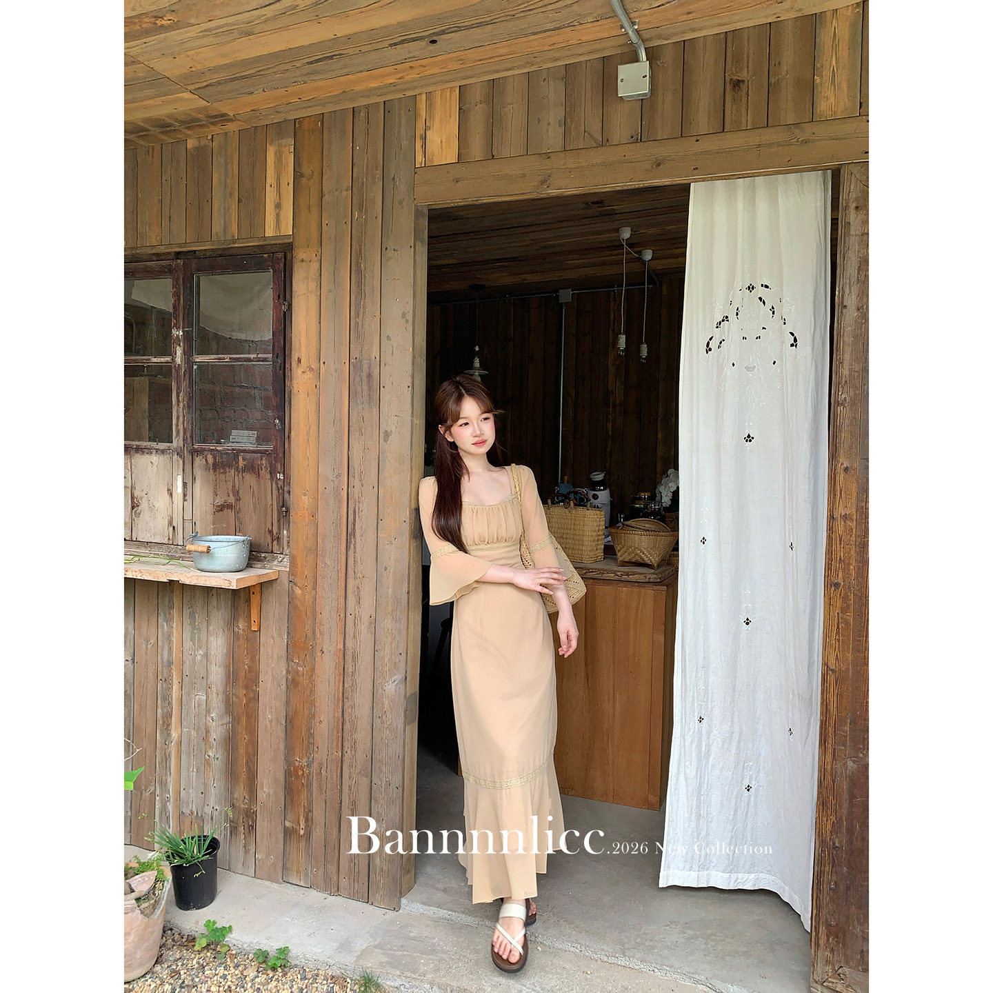 板栗西西【人间秀珠】法式方领七分袖收腰连衣裙子女初夏气质长裙