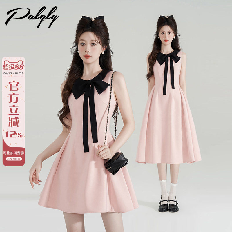 小香风粉色蝴蝶结挂脖连衣裙女夏季法式收腰千金风荷叶边a字裙子