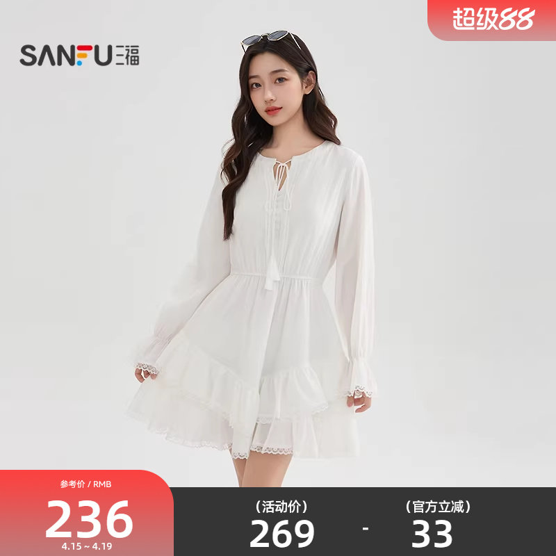三福白色连衣裙2026新款夏季蕾丝拼接摆绑带领口短裙子女装520153