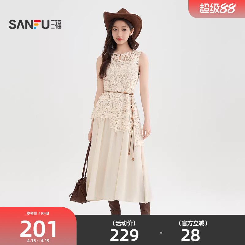 三福连衣裙女2026新款夏季气质蕾丝罩衫吊带裙子两件套女装520257