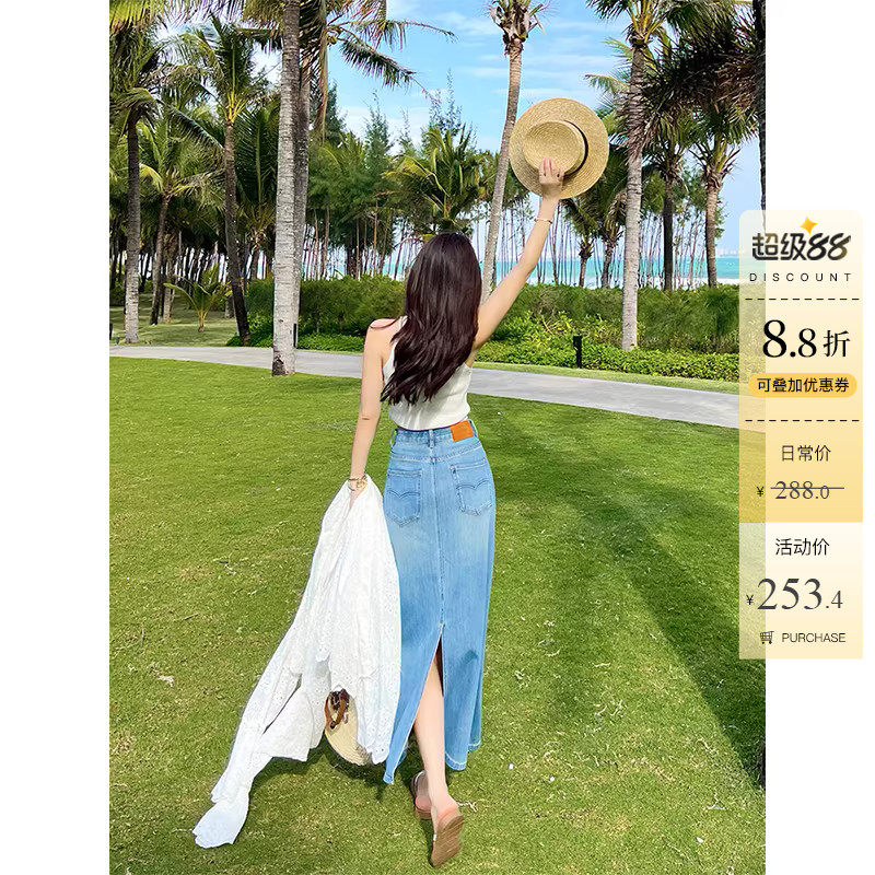 定制面料~后开叉高腰牛仔裙女春夏新款蓝色包臀显瘦A字中长裙子