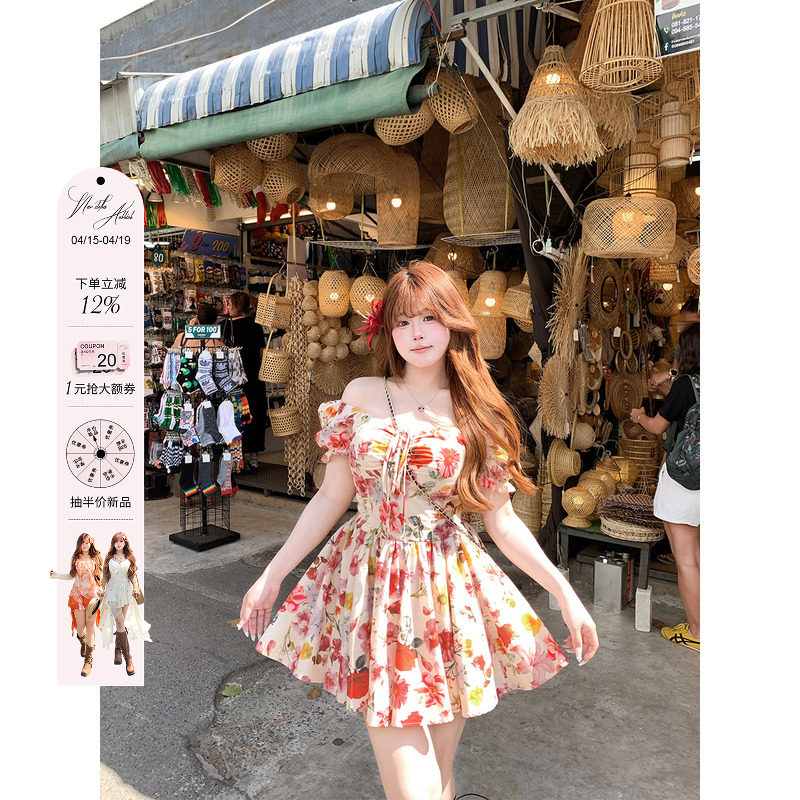 安妮不火 度假风高饱和印花泡泡袖连衣裙女微胖大码文艺收腰裙子