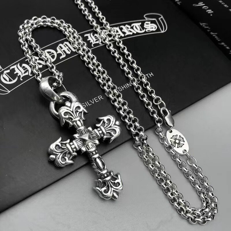CH潮牌项链克罗伈火焰十字架泰银吊坠时尚男女嘻哈珍珠链霸气个性