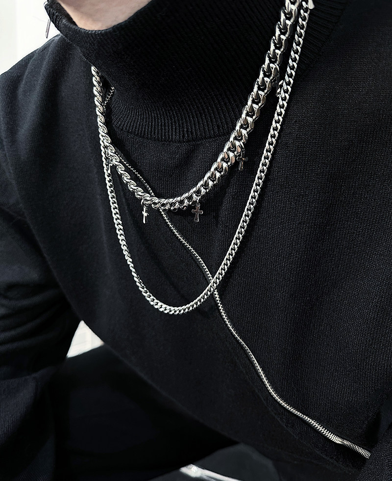 潮牌项链复古暗黑双层十字架钛钢不掉色吊坠轻奢男女毛衣链高级感