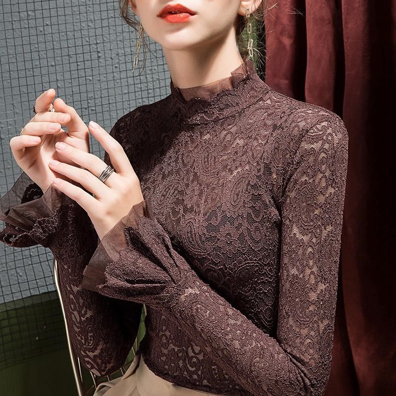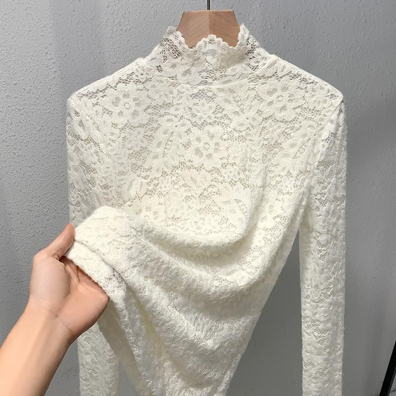 欧货半高领蕾丝打底衫女秋冬女装2021新款内搭长袖镂空雷丝上衣