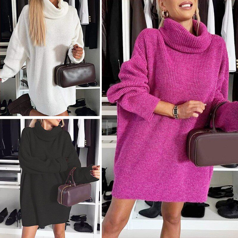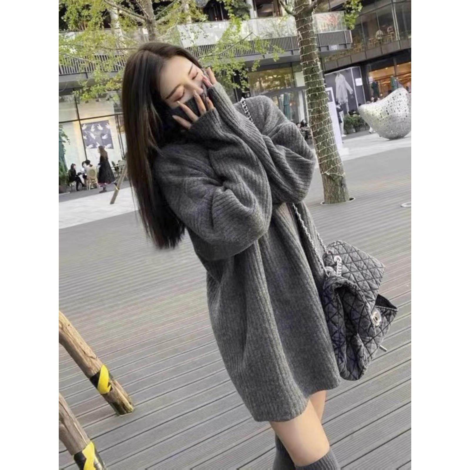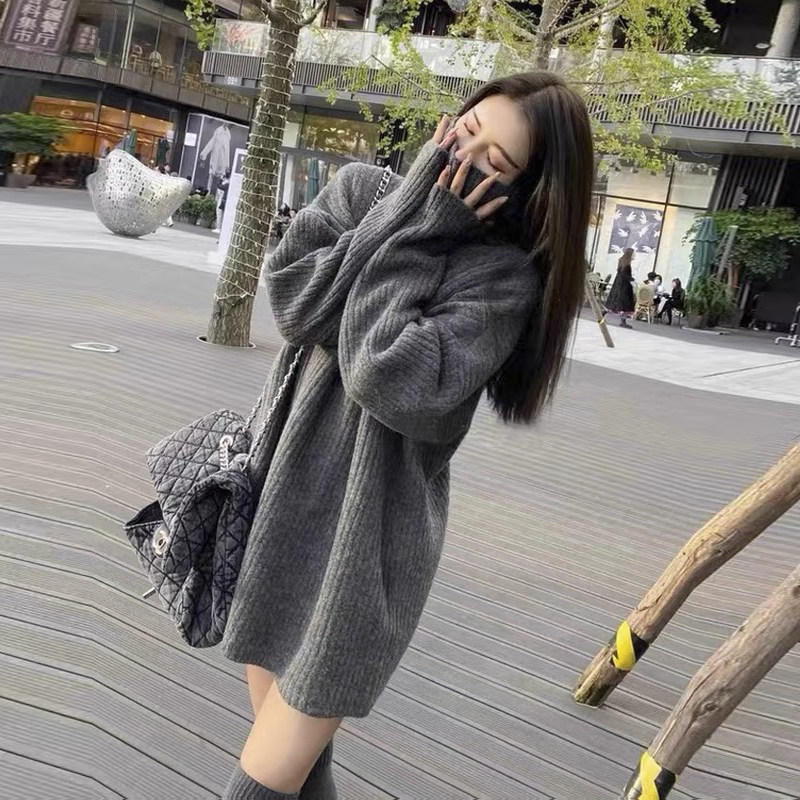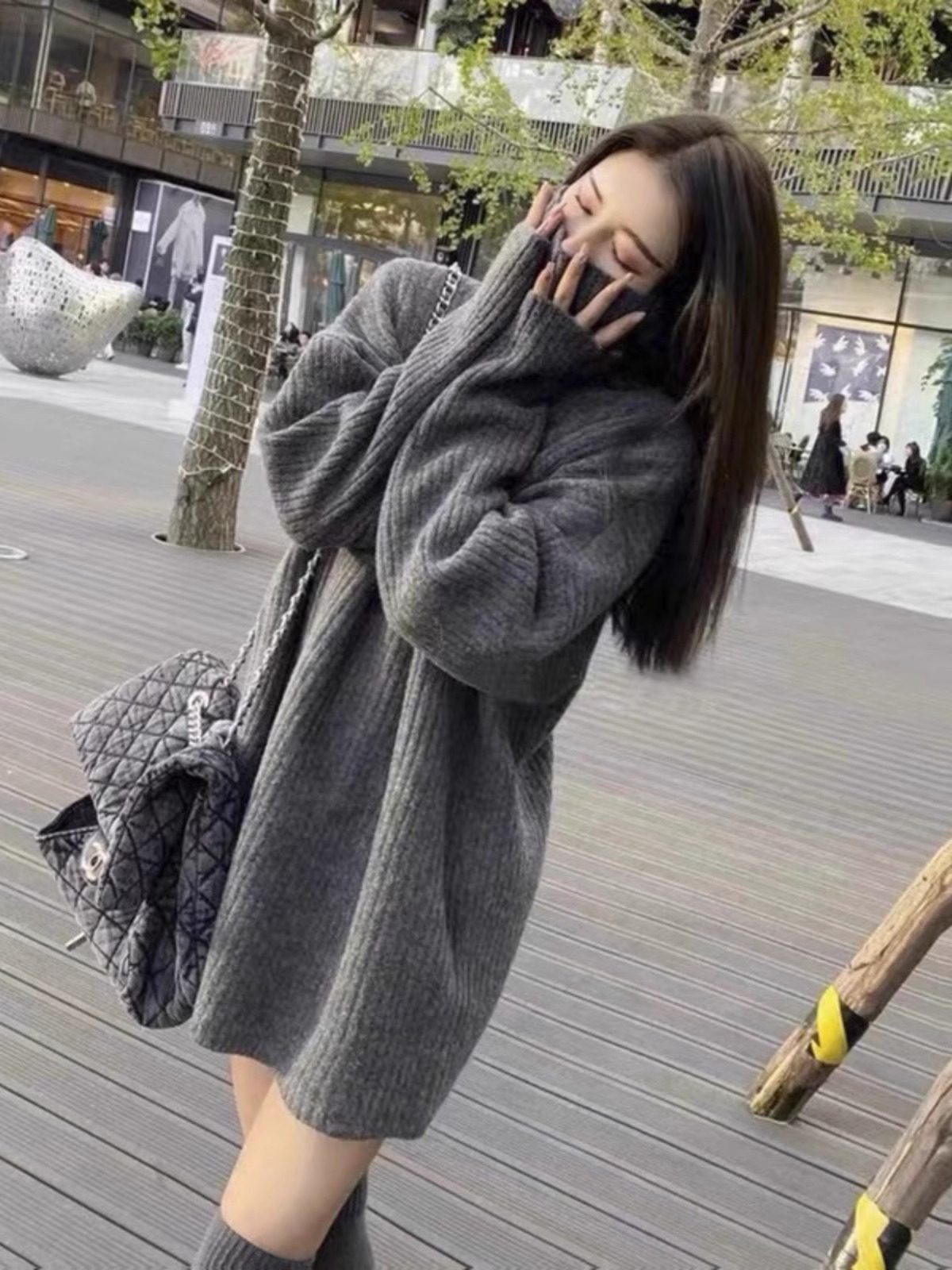 半高领中长款毛衣女装慵懒加厚针织连衣裙秋季长袖宽松外套羊毛衫
