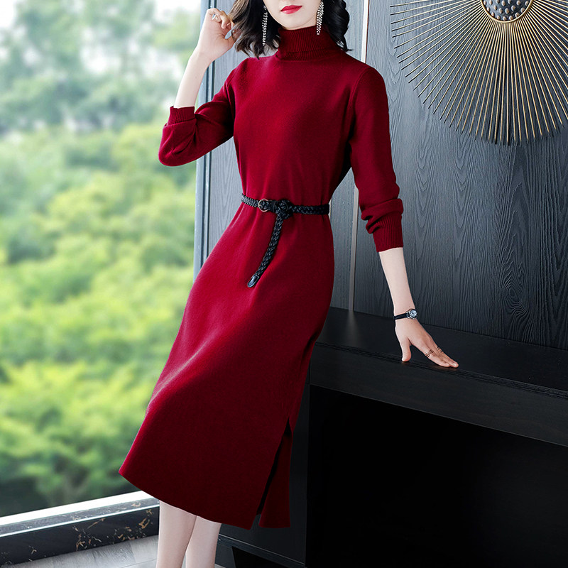 新年连衣裙女冬季内搭2025新款显瘦裙子气质过膝中长款高领毛衣裙