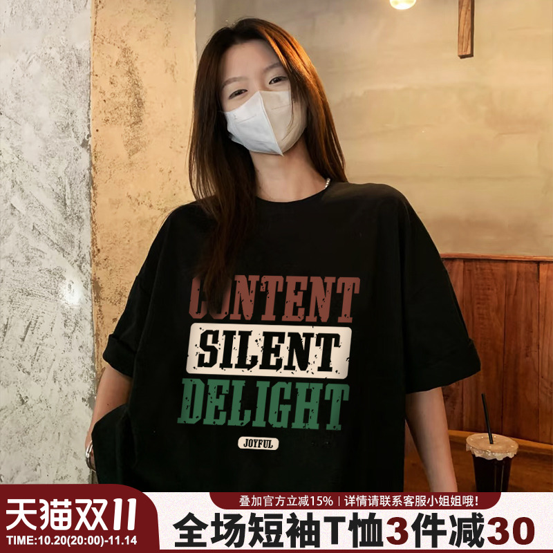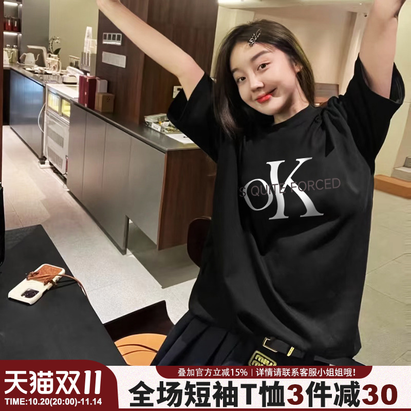 邝玲玲同款美式潮牌字母印花黑色短袖t恤女士夏季宽松圆领上衣服