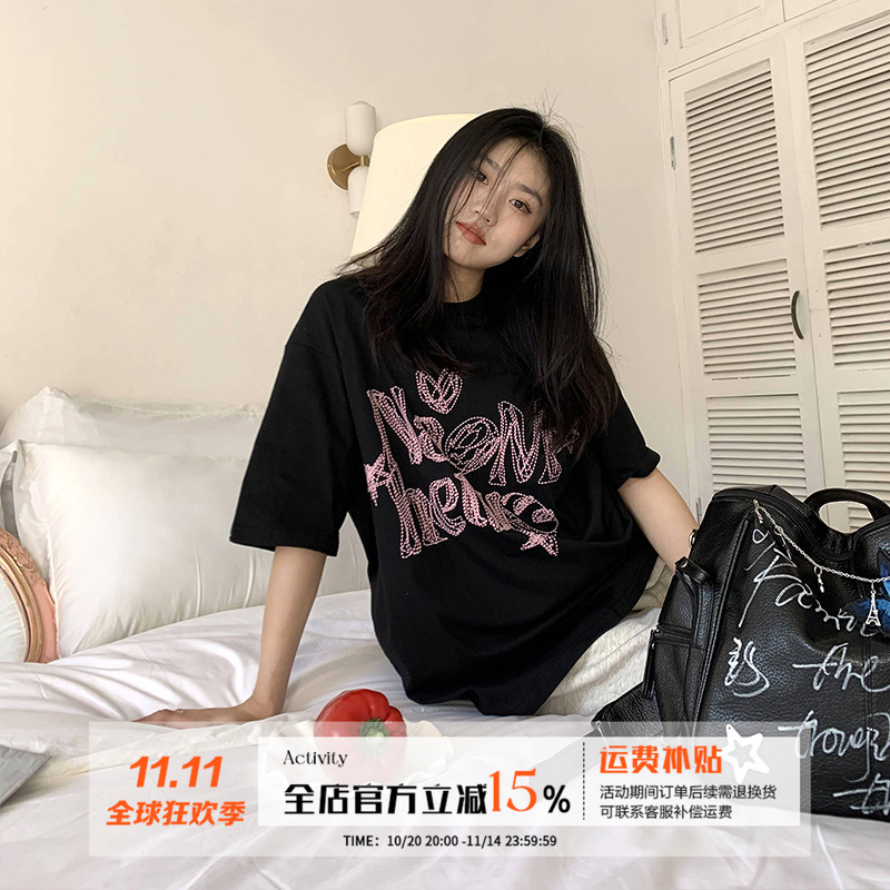 纯棉夏季重工黑色t恤女烫钻字母早春宽松宽松圆领短袖上衣ins潮牌