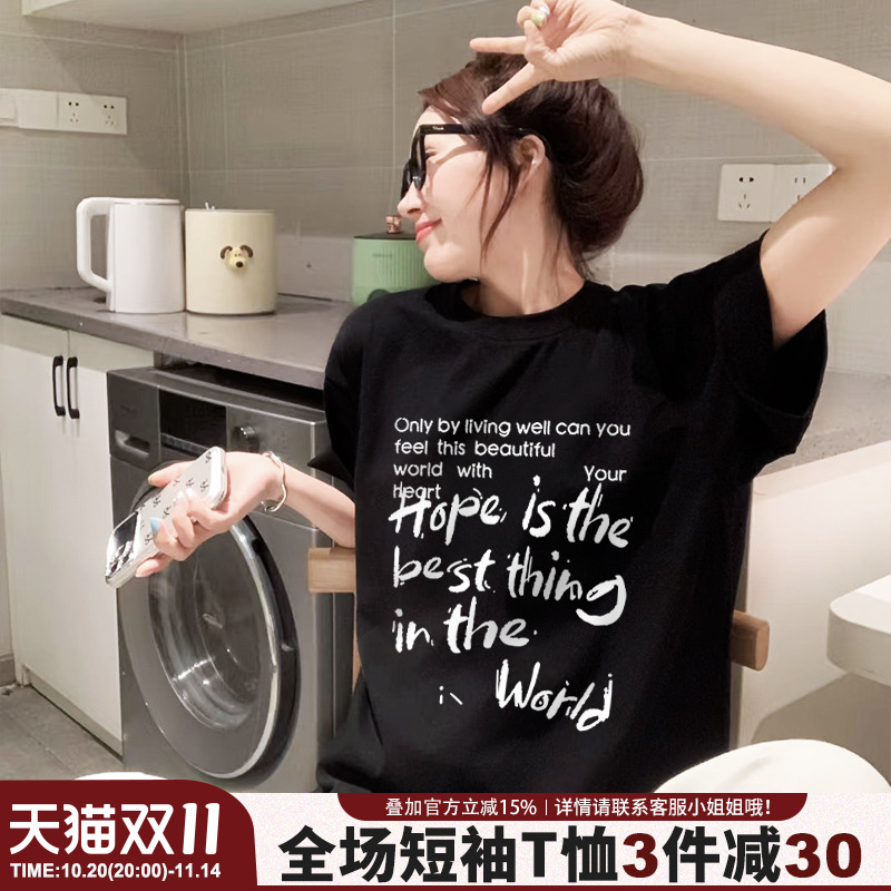 2025新款短袖t恤女白色纯棉大码宽松半袖显瘦字母印花体恤黑色
