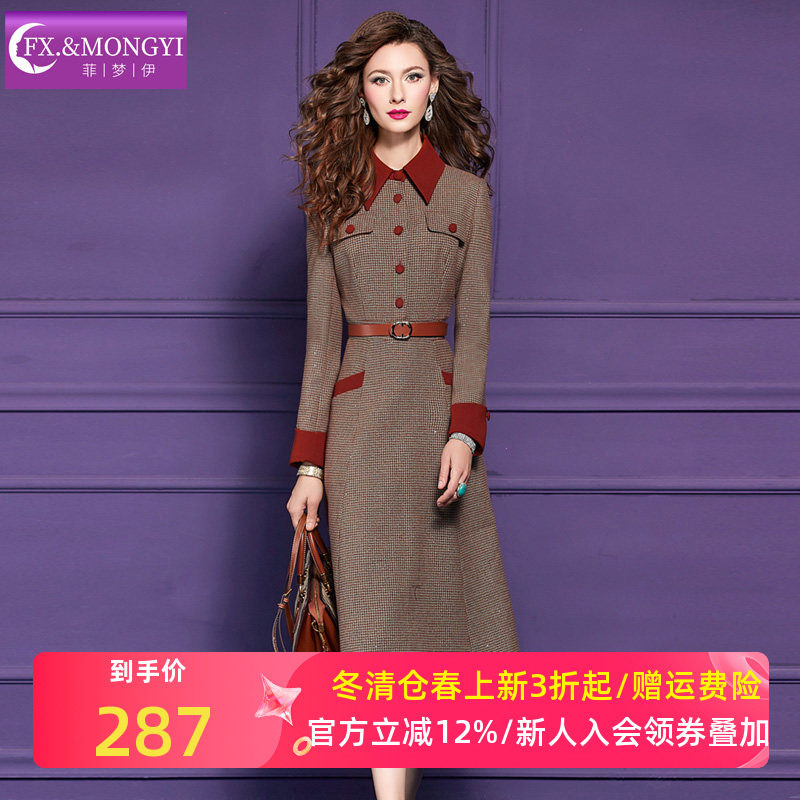 菲梦伊含羊毛格子衬衫连衣裙女冬季复古高级感名媛收腰中长毛呢裙