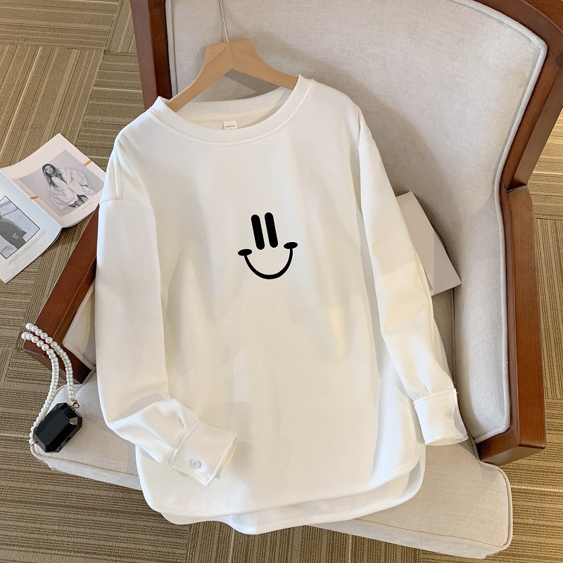 Fjwldy大码笑脸印花前后长袖圆领薄款卫衣女春秋新款时尚宽松上衣
