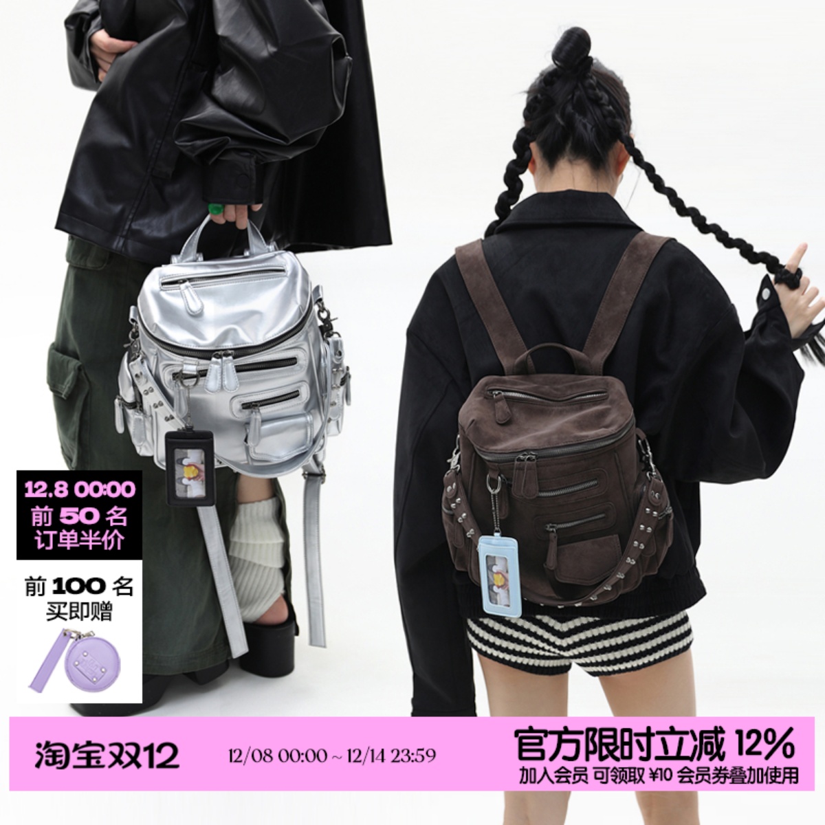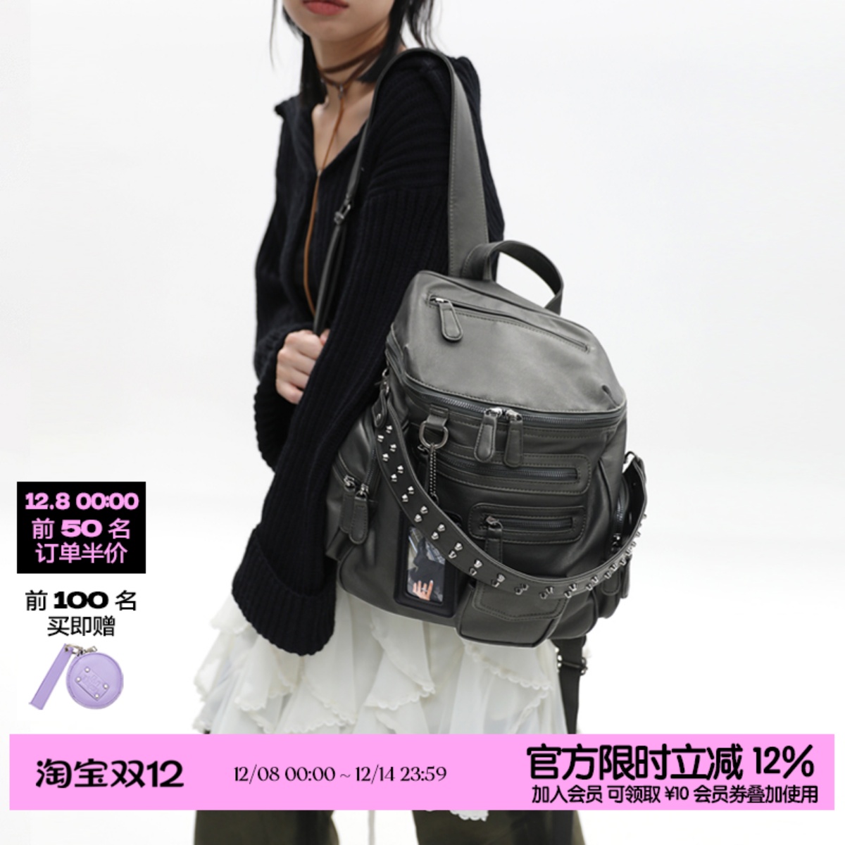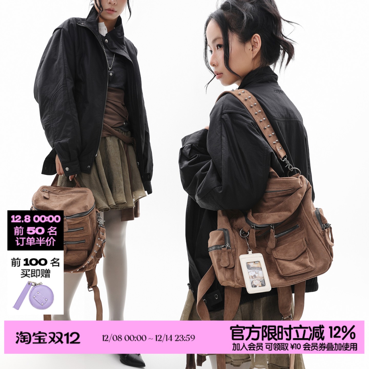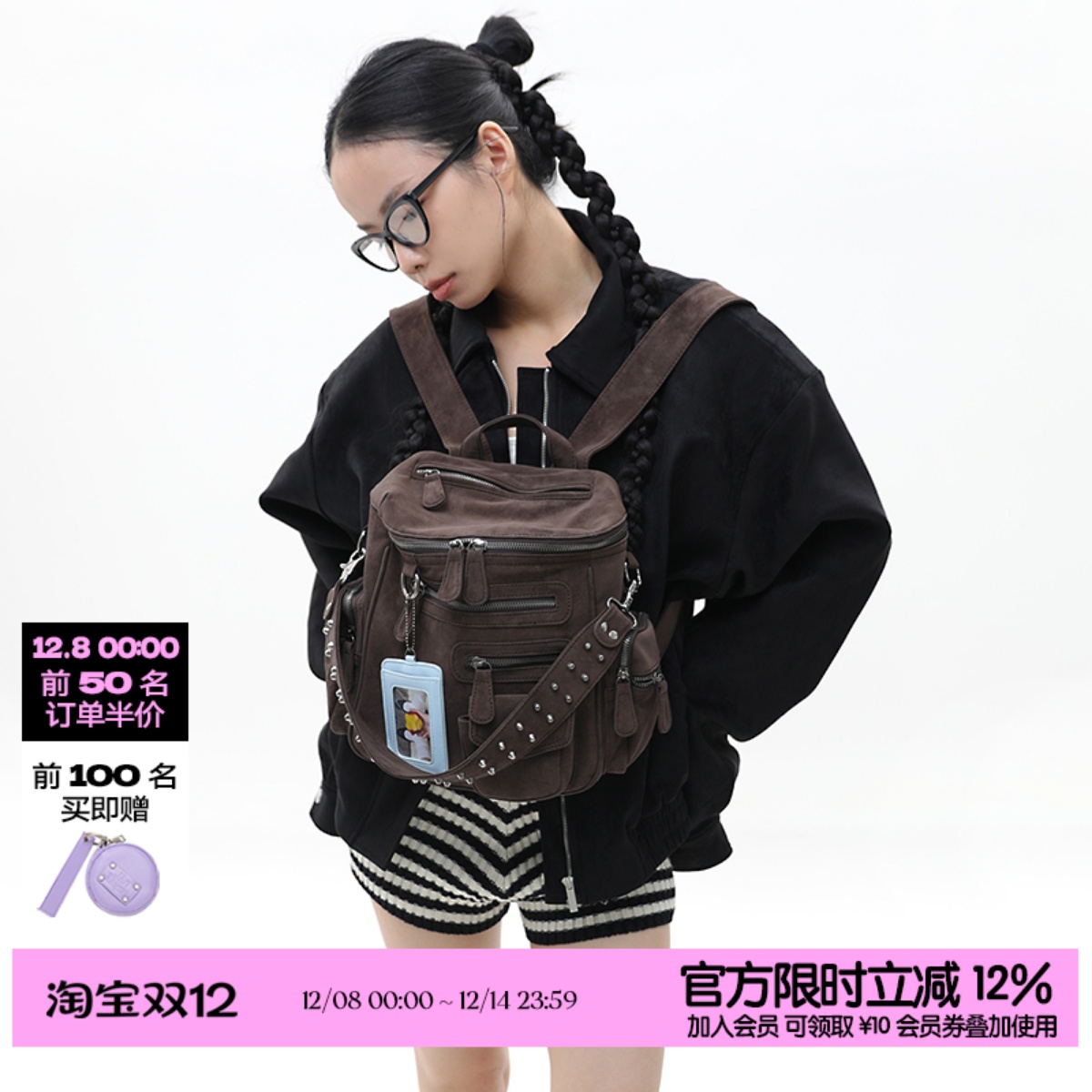 简着25AW 原创 小野棕 里斯多口袋拉链铆钉双肩包 单肩机车背包