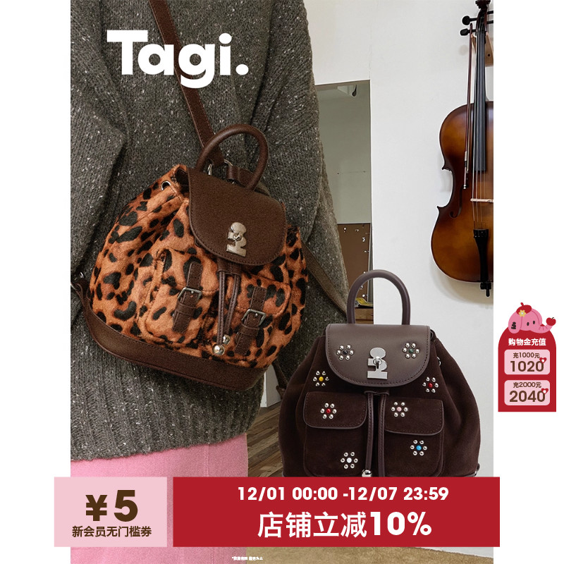Tagi.Mini 怦怦小花麂皮铆钉双肩包旅行便携口袋抽绳束口包