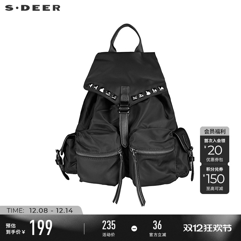 sdeer圣迪奥女装冬装个性铆钉尼龙双肩包背包S21483837【质量】