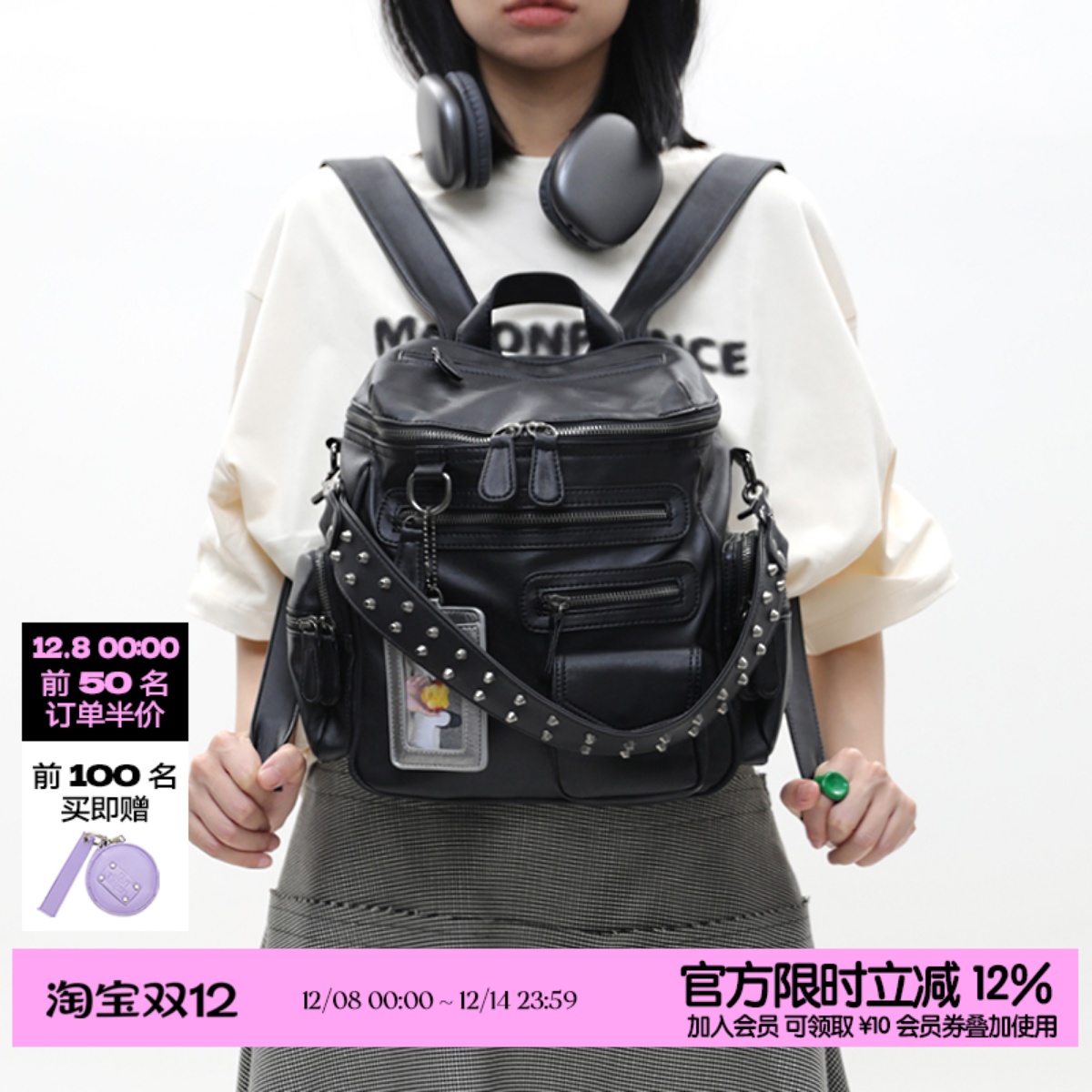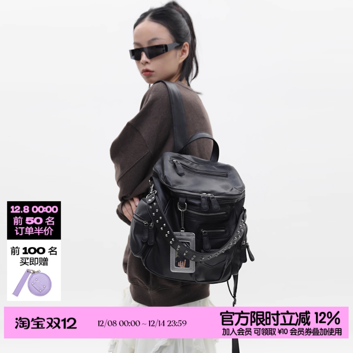 简着 /原创 里斯林肯高级黑多口袋拉链辣妹铆钉机车Y2K单肩双肩包