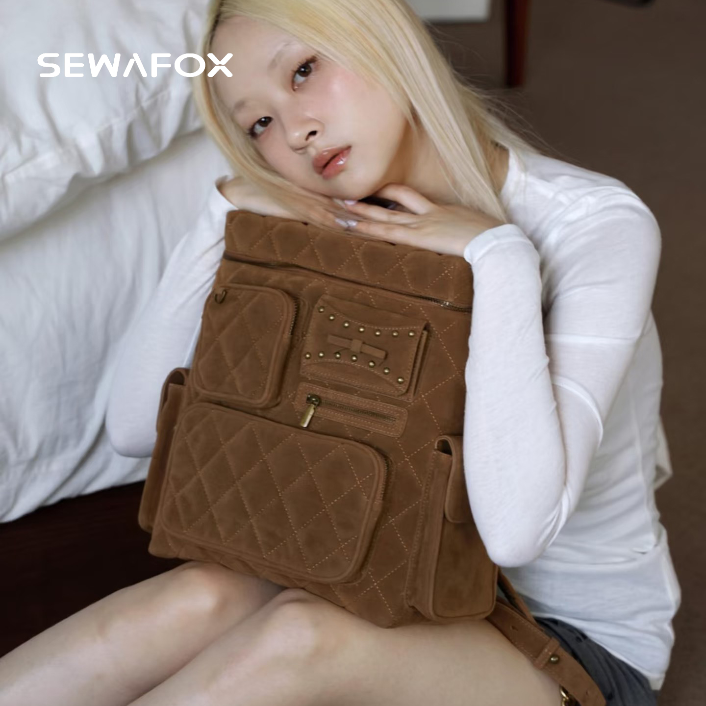 风麂皮铆钉双肩包25新款小众设计感盒子包女大容量背包大学生书包