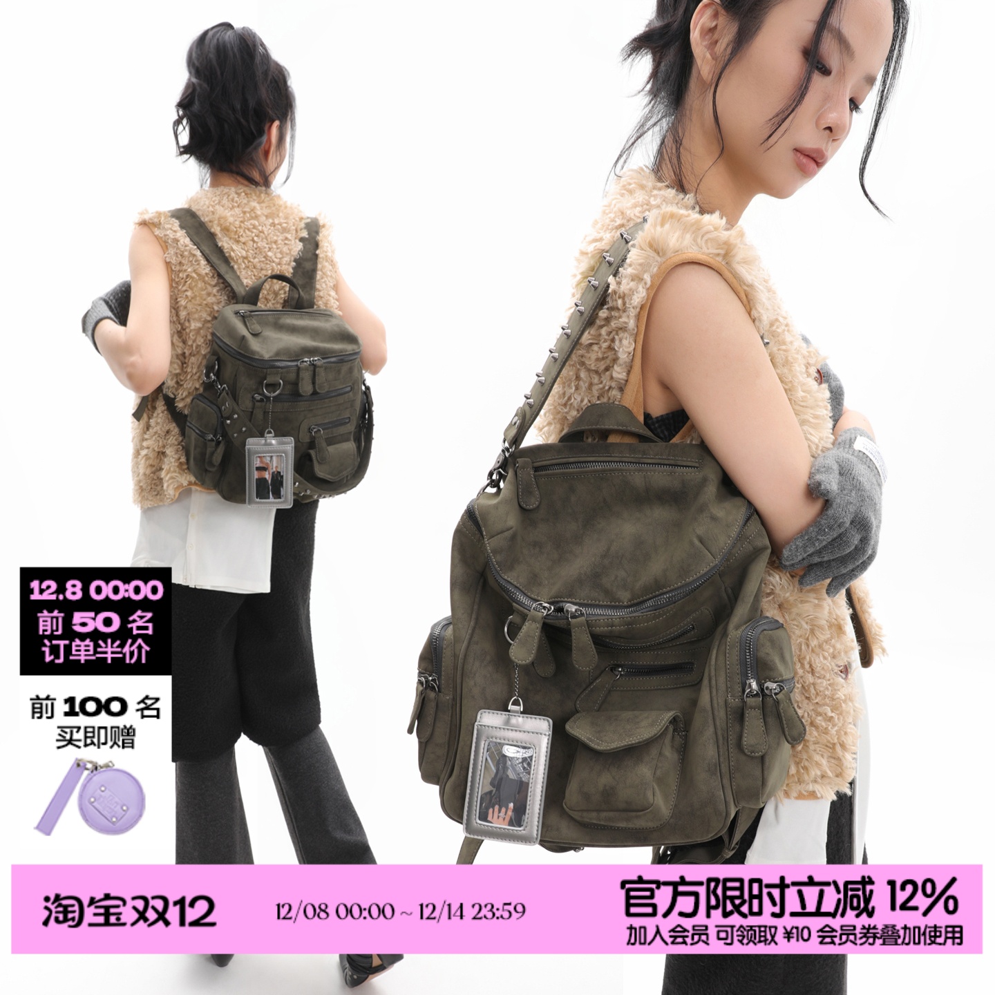 简着25AW原创苔藓绿里斯多口袋拉链铆钉书包女双肩包单肩机车背包