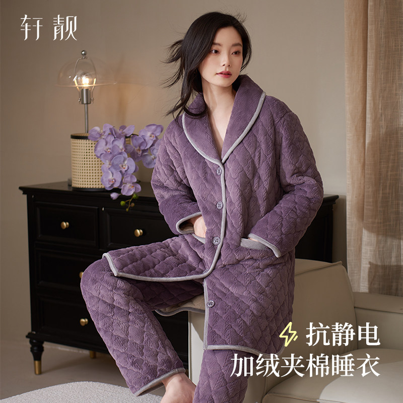 轩靓睡衣女款冬季三层加厚夹棉抗静电珊瑚绒可外穿大码家居服套装