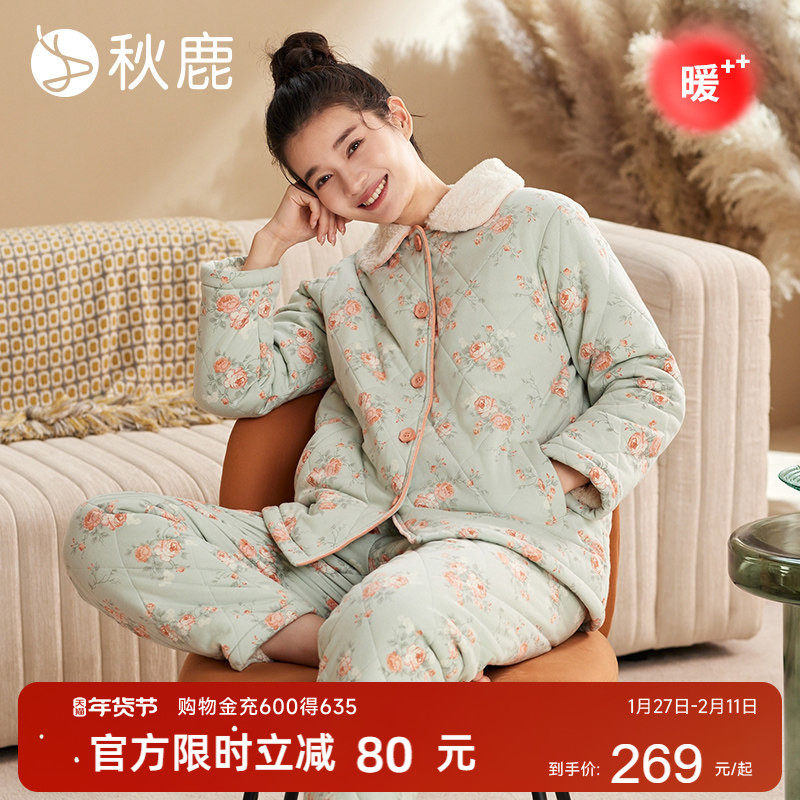睡衣女士秋冬季三层加厚珊瑚绒夹棉袄保暖加绒新款中青年人家居服