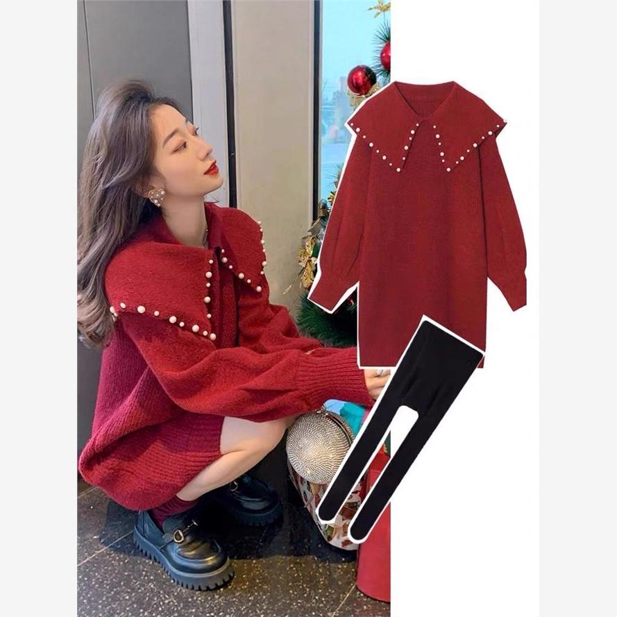高级感红色毛衣裙女士中长款秋冬2024新款小个子遮屁股加厚打底衫