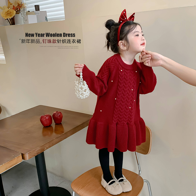 女童连衣裙新年衣服秋装2025新款儿童红色毛衣裙新年战袍拜年裙子