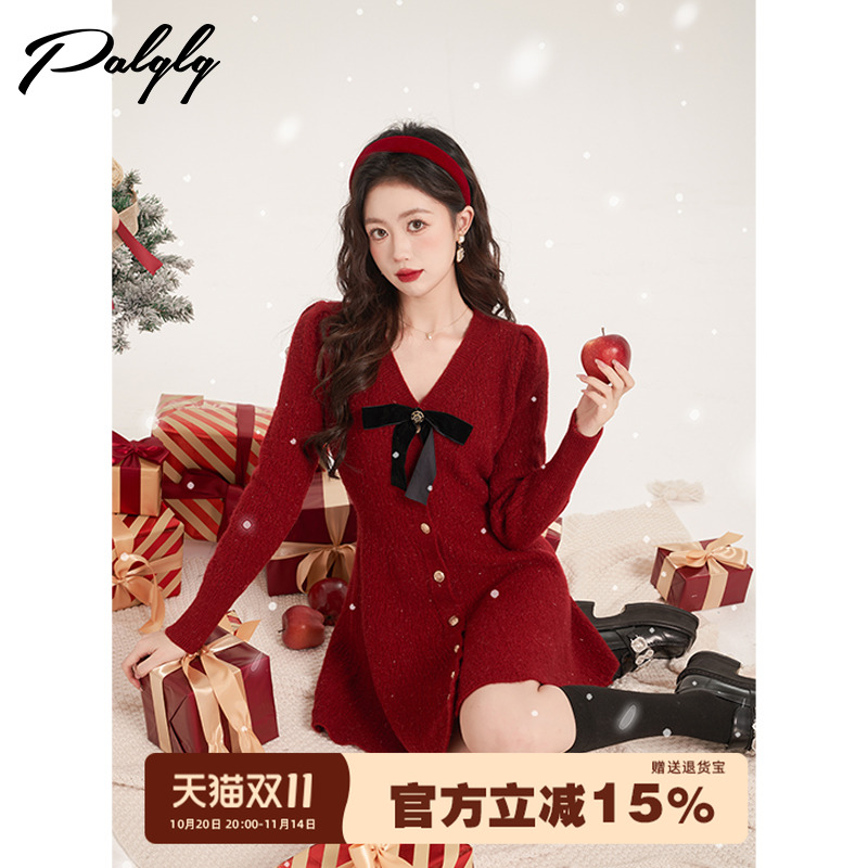 慵懒风V领毛衣连衣裙女红色秋冬季法式针织打底长袖新年战袍裙子