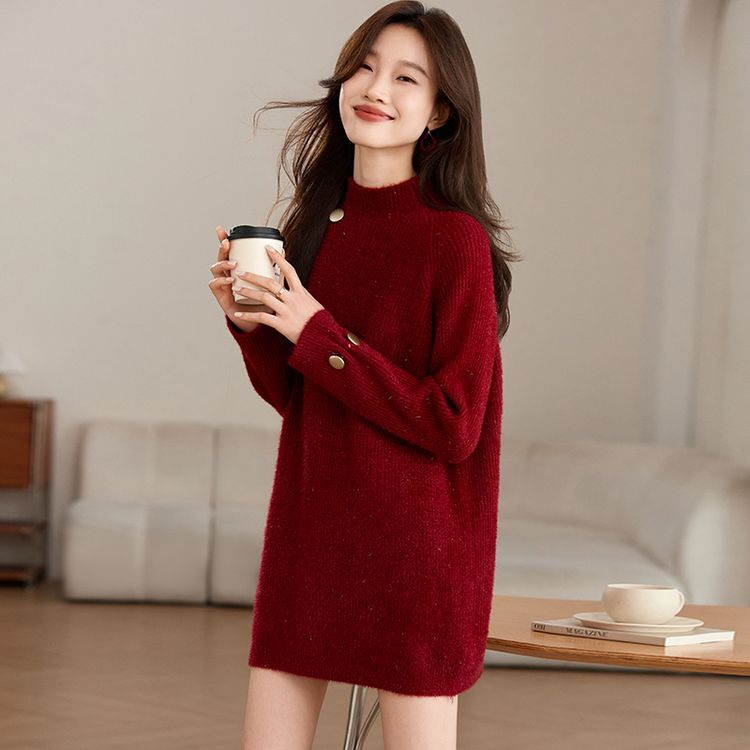 半高领新年红色毛衣裙秋冬季2025新款内搭中长款针织打底衫加厚