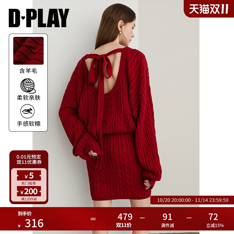 DPLAY2025秋季新款红色连衣裙女新年本命年含羊毛针织红色毛衣裙
