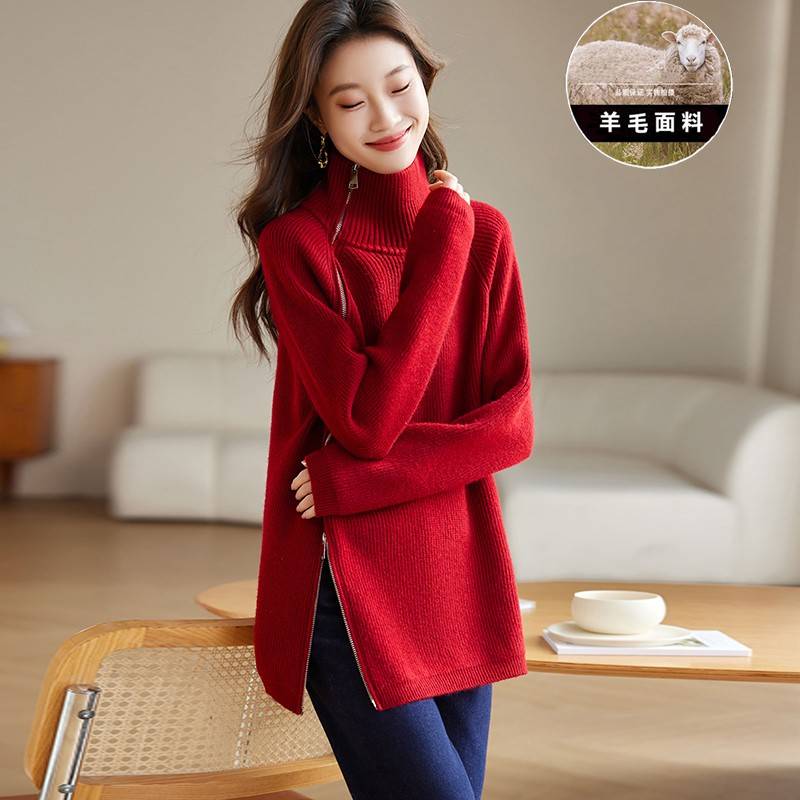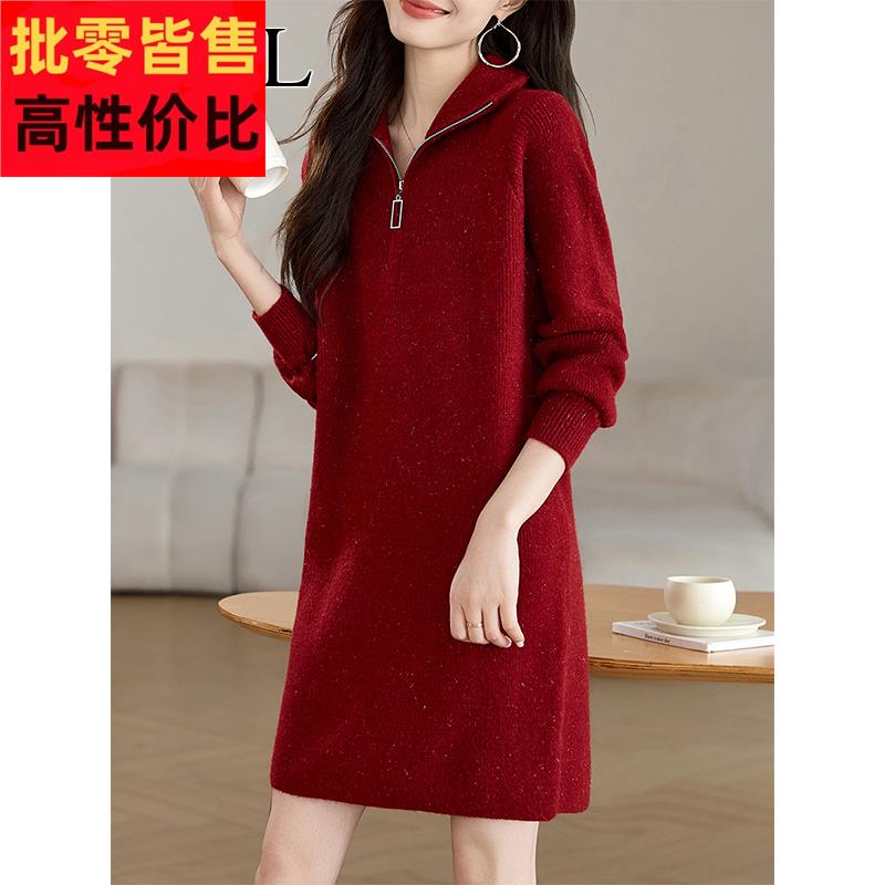 秋冬半拉链毛衣女高级感气质闪光亮丝中长款宽松遮肚子红色毛衣裙