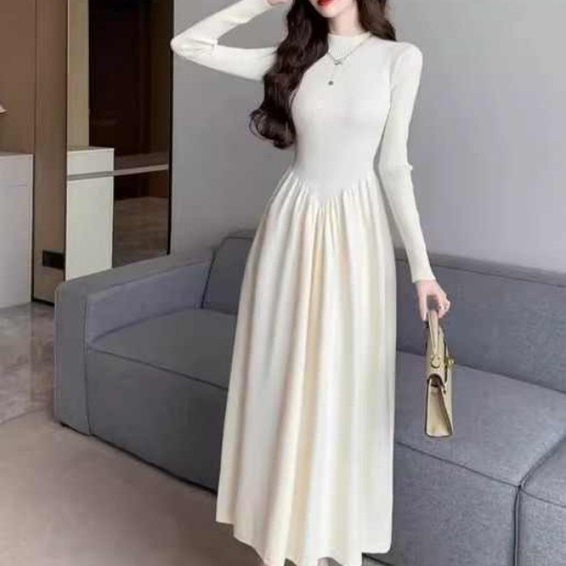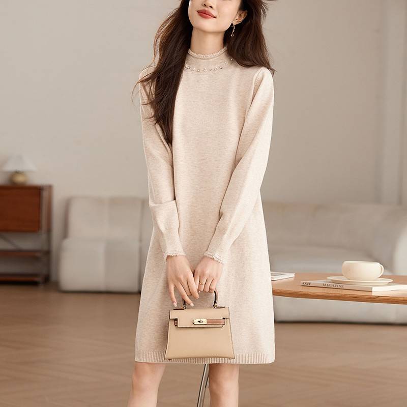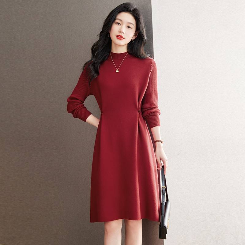 法式半高领长袖针织连衣裙秋冬配大衣内搭打底高级感红色毛衣裙子