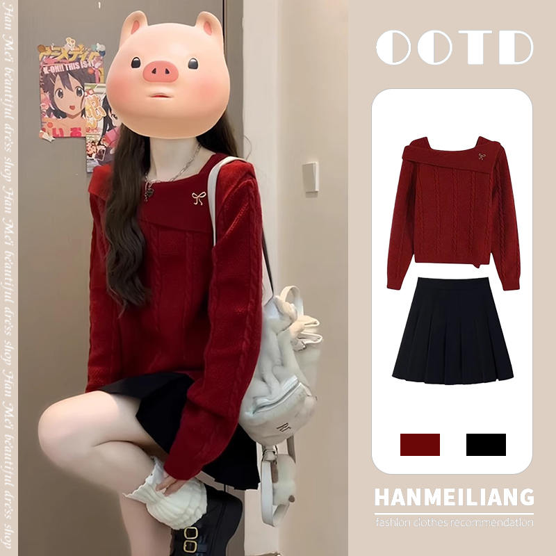FF BLUE 秋日倒叙诗 蝴蝶结氛围感红色毛衣女显瘦百褶裙减龄套装