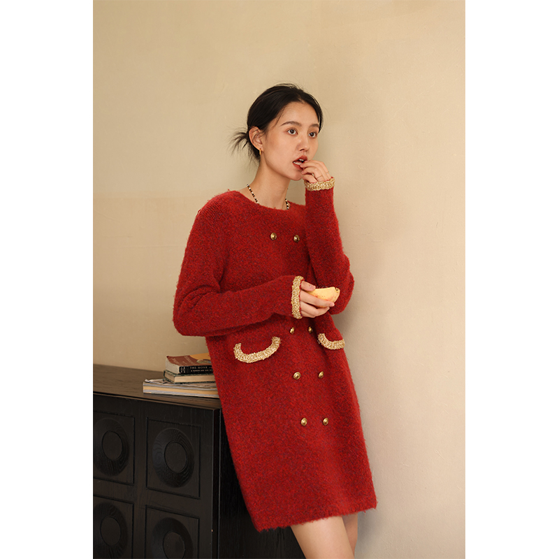 DPLAY2025秋季气质复古红色连衣裙女法式气质订婚长款针织毛衣裙